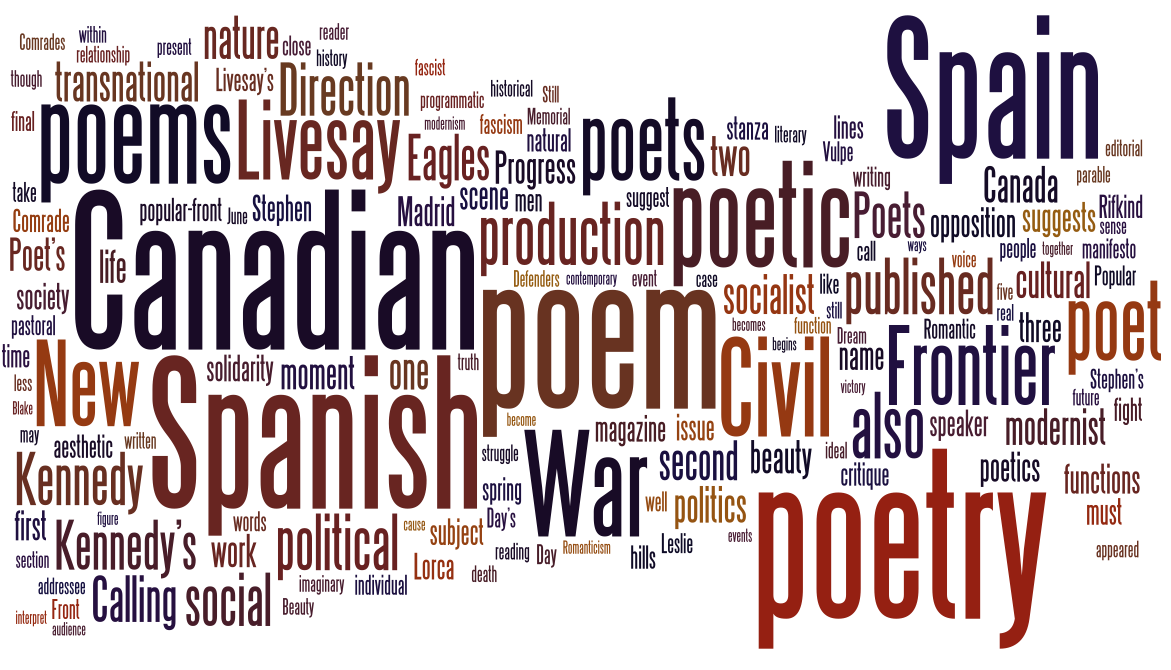 “From Transnational Politics to National Modernist Poetics: The Spanish Civil War Poetry in New Frontier.” Canadian Literature 204 (Spring 2010): 44–60. [visualisation]